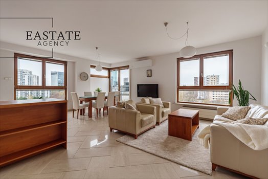 This spacious, elegant 128 m² apartment is situated on the 6th floor of a modern building. Thanks to its three-sided exposure (east-south-west), the interiors are bright throughout the day, and large windows provide excellent natural light and stunning city views.