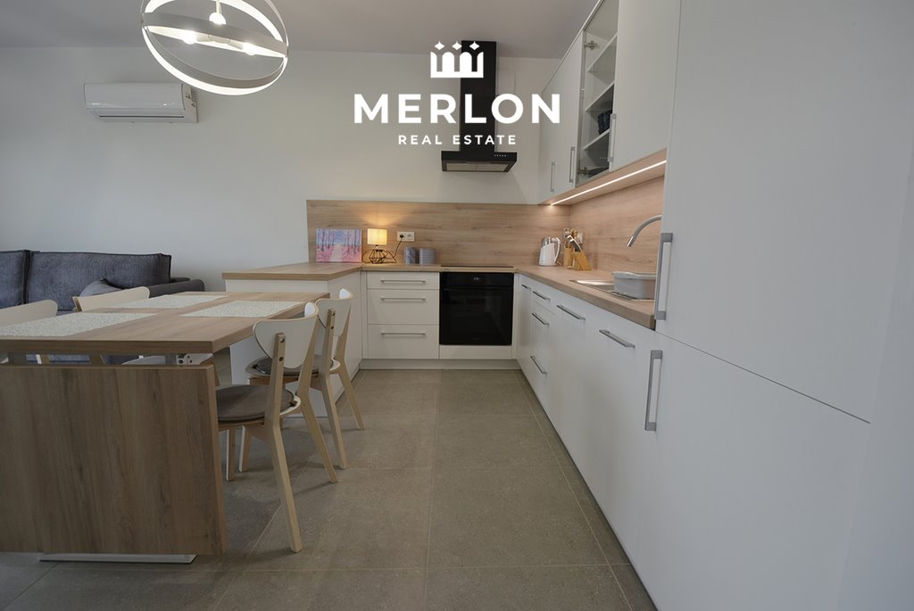 Wnętrze zachwyca nowoczesnością, spójną estetyką oraz wysoką jakością zastosowanych materiałów. Apartament jest w pełni umeblowany i wyposażony, gotowy do wprowadzenia od zaraz. W salonie znajduje się klimatyzacja, wygodna sofa oraz strefa RTV. Zabudowa kuchenna została wyposażona w komplet sprzętów AGD, w tym płytę indukcyjną, piekarnik, lodówkę oraz zmywarkę. Całość dopełnia część jadalniana z rozkładanym stołem. W większej sypialni znajduje się łóżko o szerokości 160 cm oraz pojemne szafy, natomiast druga sypialnia doskonale sprawdzi się jako pokój dla dziecka, gabinet z komfortową przestrzenią do pracy.