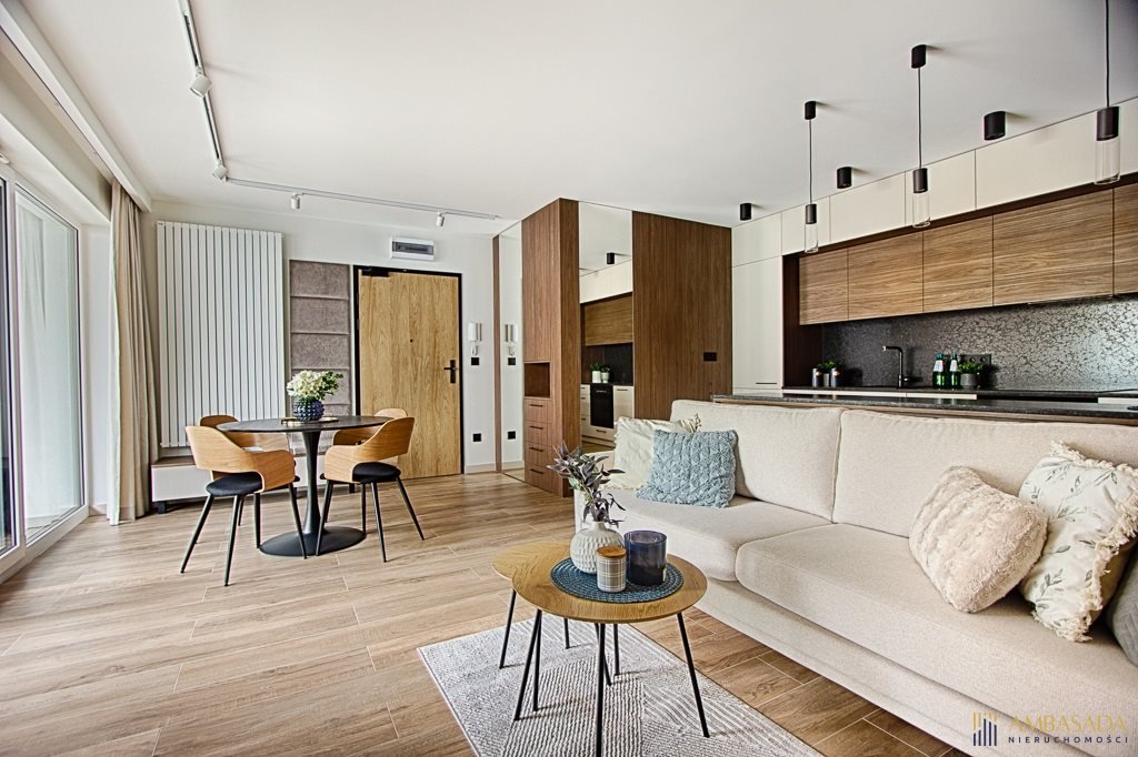 Na powierzchnię 45,74 m 2 składa się przestronny aneks kuchenny z salonem i wyjściem na balkon, sypialnia oraz łazienka. Wnętrze wykończone w nowoczesnym i funkcjonalnym stylu. Kuchnia doskonale wyposażona, znajduje się w niej zmywarka, płyta indukcyjna, piekarnik, okap, oraz lodówka. Jasny salon z wygodną kanapą, telewizorem oraz z miejscem na strefę śniadaniową Sypialnia z łóżkiem i komodą. Łazienka z wc oraz kabiną typu walk-in, zaś w przedpokoju funkcjonalna zabudowa oraz garderoba .
