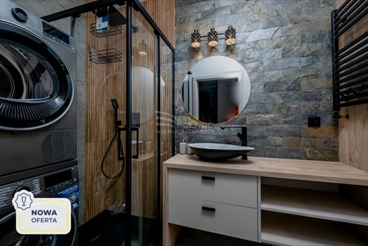 - łazienka z wc: zabudowa szafek, kabina prysznicowa, umywalka z szafką, pralka, suszarka