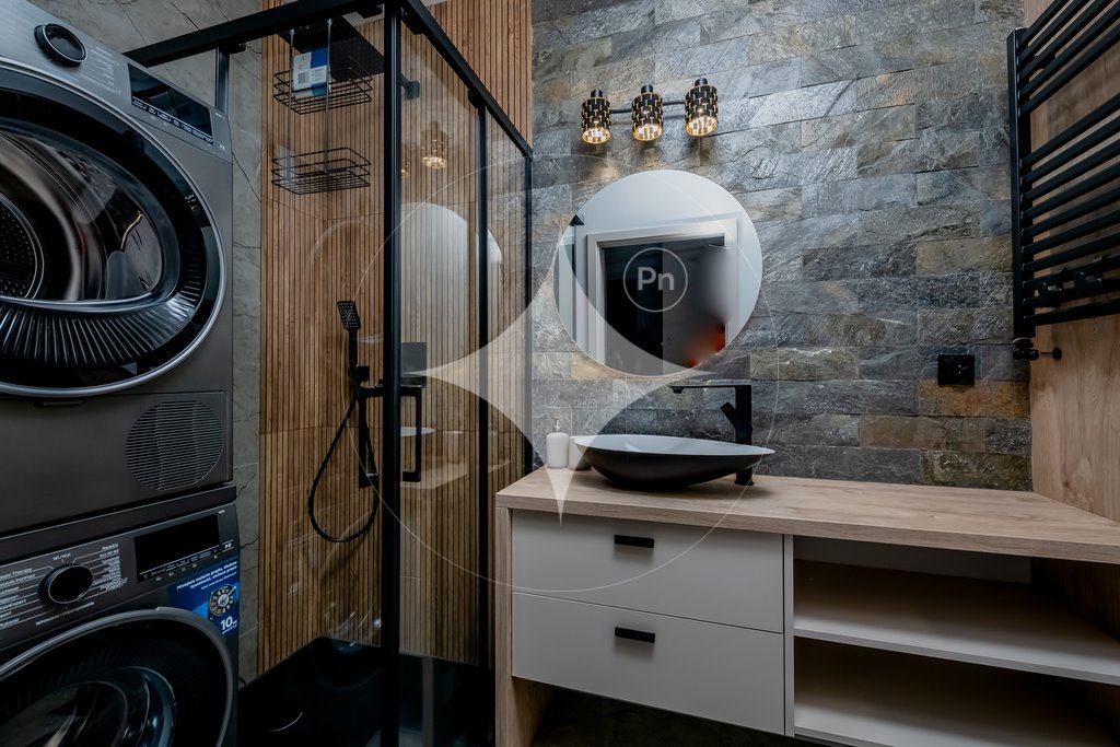 - łazienka z wc: zabudowa szafek, kabina prysznicowa, umywalka z szafką, pralka, suszarka