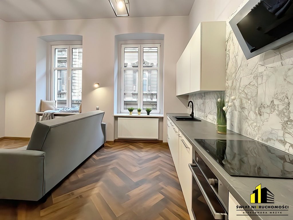 Do wynajęcia nowoczesny apartament o powierzchni ok. 35 m² z antresolą, zlokalizowany na 1. piętrze odrestaurowanej kamienicy w ścisłym centrum miasta.