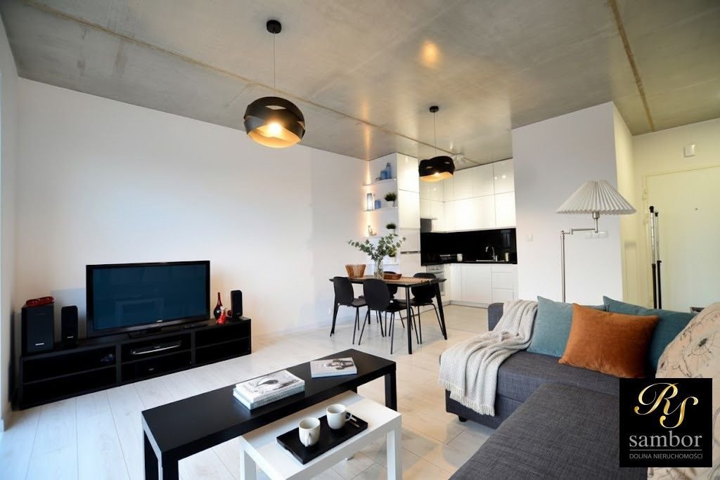 - Przestrzenny stylowy salon z wyjściem na balkon, sofą, TV, oraz miejscem do jedzenia