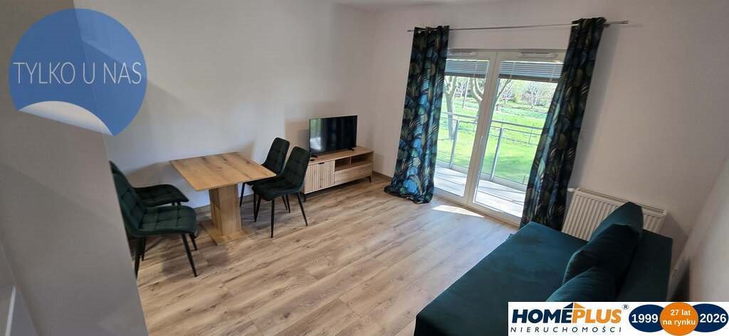 kuchnia w zabudowie i wyposażeniem AGD, stół z krzesłami, rozkładana kanapa, szafka pod TV, telewizor, wyjście na balkon
