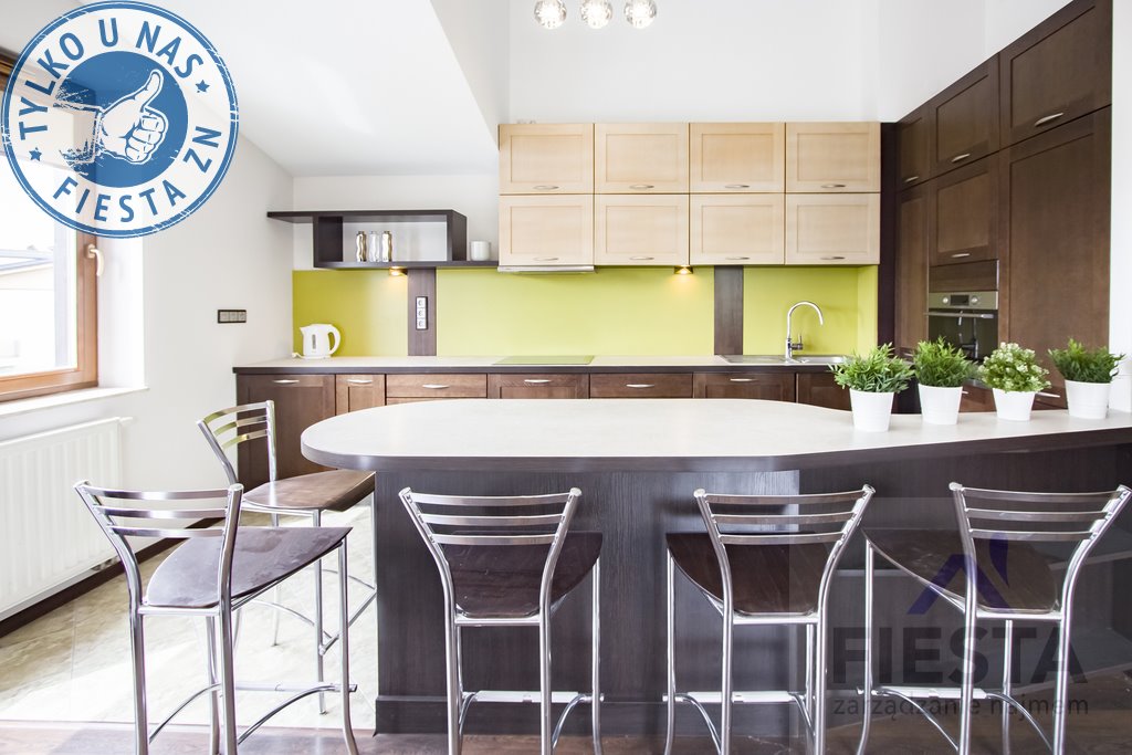 Ponadnormatywna przestrzeń dzienna daje możliwość przyjmowania gości, a wyposażenie kuchni umożliwia wygodne przygotowywanie posiłków.