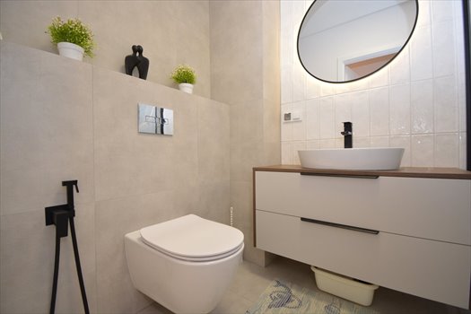 Łazienka połączona z WC. Jest szeroka, wyposażona w wygodny prysznic i pralkę oraz komodę.