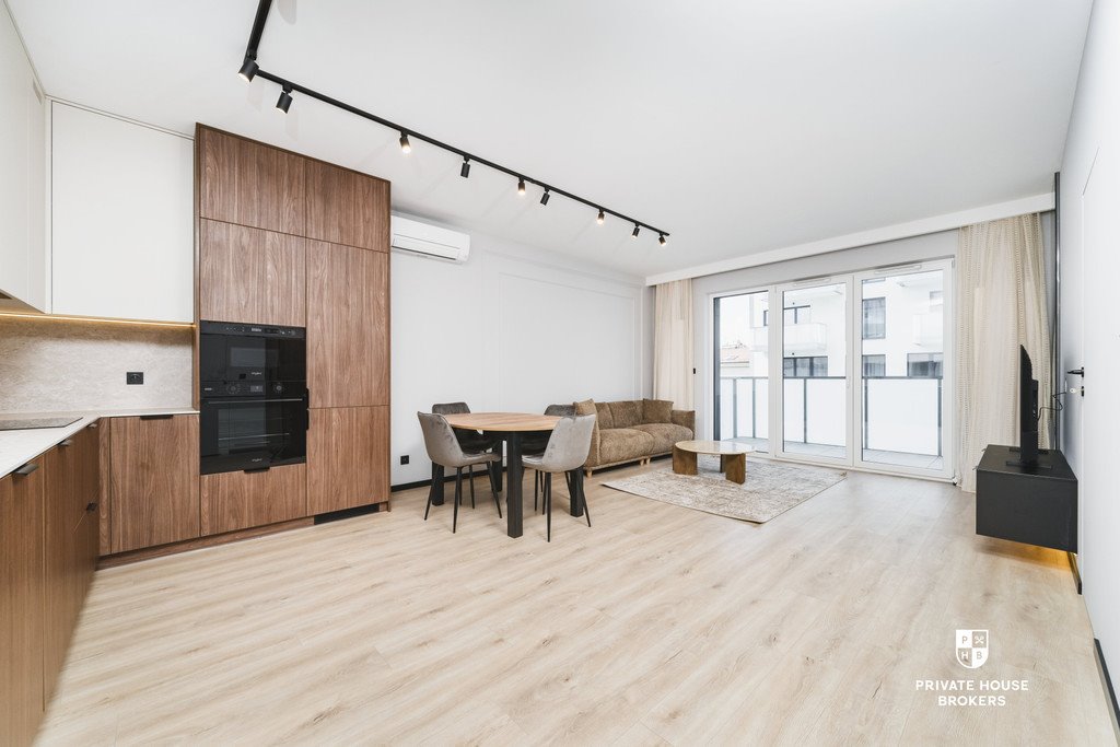 Mieszkanie składa się z przestronnego salonu z aneksem kuchennym, osobnej sypialni, łazienki oraz balkonu. Wnętrze jest jasne i funkcjonalnie zaprojektowane, idealne dla singla lub pary. Kuchnia wyposażona jest w nowoczesny sprzęt AGD (lodówka, płyta grzewcza, piekarnik, zmywarka), a łazienka w pralkę i wysokiej jakości armaturę.