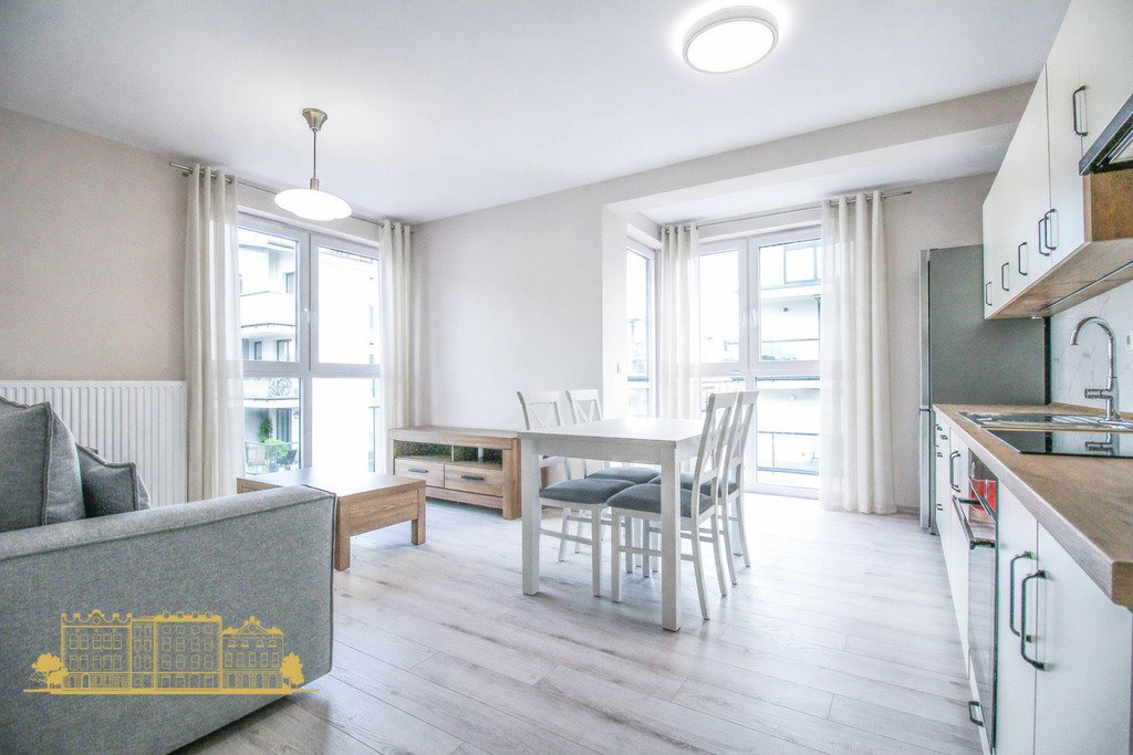 Mieszkanie jest gotowe do zamieszkania. Zostało wyposażone w wysokiej klasy energetycznej sprzęty AGD i RTV. Wyposażenie kuchni to m.in. ZMYWARKA, piekarnik, płyta grzewcza, duża chłodziarko-zamrażarka. W salonie: stół, krzesła, szafka pod TV, stolik kawowy oraz kanapa. W sypialni znajduje się podwójne łóżko z materacem, szafka nocna oraz pojemna szafa w zabudowie. W łazience - wanna z funkcją prysznica, pralka, umywalka z szafką, lustro, grzejnik drabinkowy.