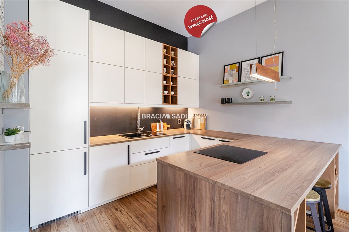 Mieszkanie w sercu starego Podgórza , 2 pokoje , w tym przestronny i funkcjonalny salon z jadalnią i dużym aneksem kuchennym .