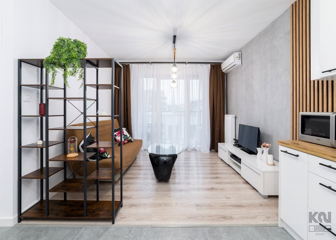 - funkcjonalny aneks kuchenny w zabudowie na wymiar z pełnym wyposażeniem: płytą indukcyjną, piekarnikiem, lodówką z zamrażarką, zmywarką, mikrofalówką;