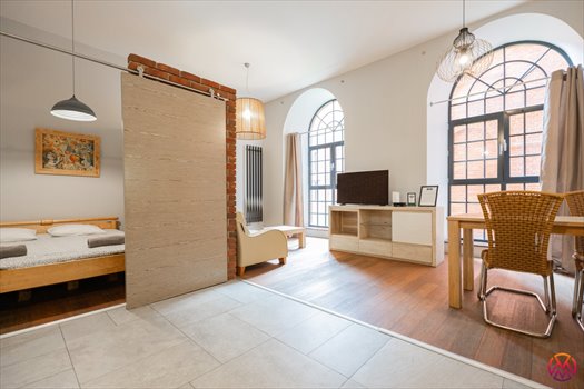 Apartament składa się z przestronnego salonu z aneksem kuchennym, wydzielonej części sypialnianej, łazienki razem z WC oraz przedpokoju z garderobą. Mieszkanie posiada duże, loftowe okna, które dodają niepowtarzalnego klimatu, a także dobrze doświetlają wnętrze.
