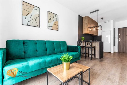 Mieszkanie w pełni umeblowane. Aneks kuchenny wyposażony w sprzęty: piekarnik, lodówka, płyta indukcyjna, zmywarka, okap.