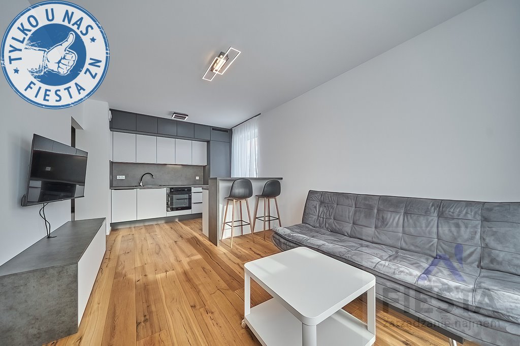 Mieszkanie składa się z sypialni, łazienki oraz salonu otwartego na kuchnię. Posiada również przestronny balkon o powierzchni 8,5 m2. Kuchnia wyposażona w sprzęt AGD (zmywarka, lodówko-zamrażarka, płyta indukcyjna, piekarnik elektryczny, okap). Salon wyposażony w rozkładaną kanapę, stolik, regał, szafkę RTV i telewizor. W łazience kabina prysznicowa, umywalka, WC oraz pralka. W przedpokoju przestronna szafa w zabudowie, siedzisko z wieszakami i wideofon. Sypialnia wyposażona w łóżko z materacem 140x200 i szufladą oraz stolik nocny. Mieszkanie wyposażone w odkurzacz, zestaw sprzątający oraz suszarkę na pranie. W mieszkaniu zamontowane są okna PCV z wystawą południową i wschodnią. Ogrzewanie z sieci miejskiej, woda ciepła z sieci miejskiej.