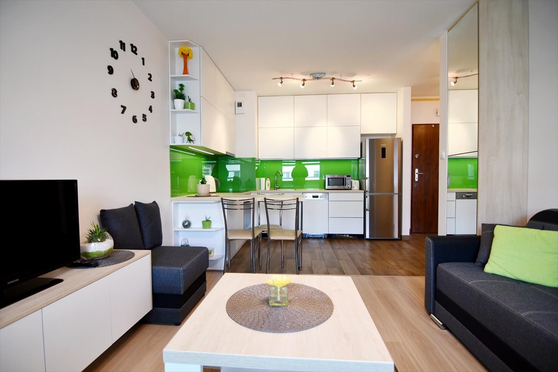 Na wyposażaniu mieszkania min. kuchnia w zabudowie z lodówką, płytą indukcyjną, piekarnikiem, zmywarką i mikrofalówką. W salonie duża kanapa, stolik RTV, telewizor, stolik. Między kuchnią i salonem wyspa z krzesłami. W sypialni, rozkładana sofa, komoda, szafa w zabudowie. W łazience wanna, pralka, geberit, umywalka z lustrem.