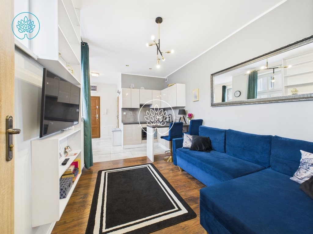 Mieszkanie składa się z bardzo jasnego, przestronnego salonu z aneksem kuchennym wyposażonego w kanapę z funkcją spania, stolik kawowy, stolik RTV, TV oraz toaletka z hokerami. Aneks kuchenny z meblami w zabudowie oraz sprzętem AGD: płyta elektryczna, piekarnik, lodówka, okap, czajnik elektryczny. Sypialnia w dużą, pojemną szafą oraz łóżkiem. Łazienka z prysznicem i toaletą. Mieszkanie jest wyposażone w pralkę.