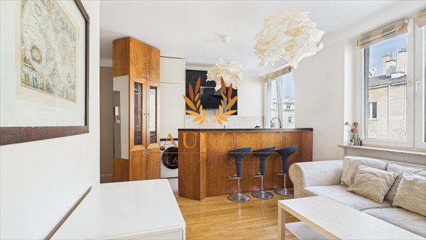 • Salon z aneksem kuchennym – jasny, z dużymi oknami, z widokiem na wewnętrzną uliczkę i mokotowskie dachy