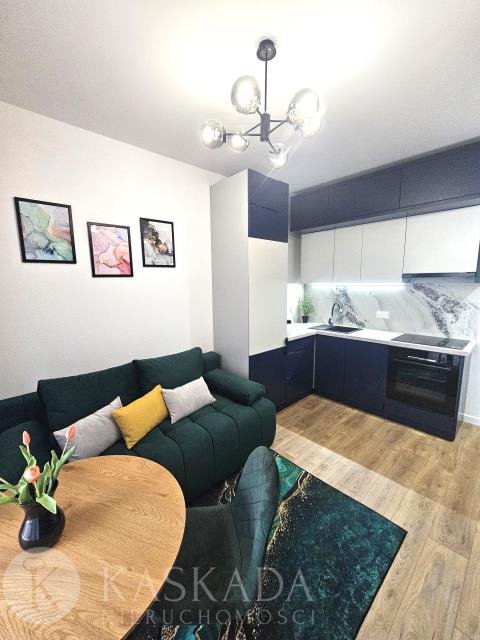Mieszkanie kompletnie umeblowane i wyposażone - kuchnia bardzo elegancka, z meblami w zabudowie, wyposażenie: płyta grzewcza, piekarnik, zmywarka, lodówka, okap kuchenny, stół i krzesła.
