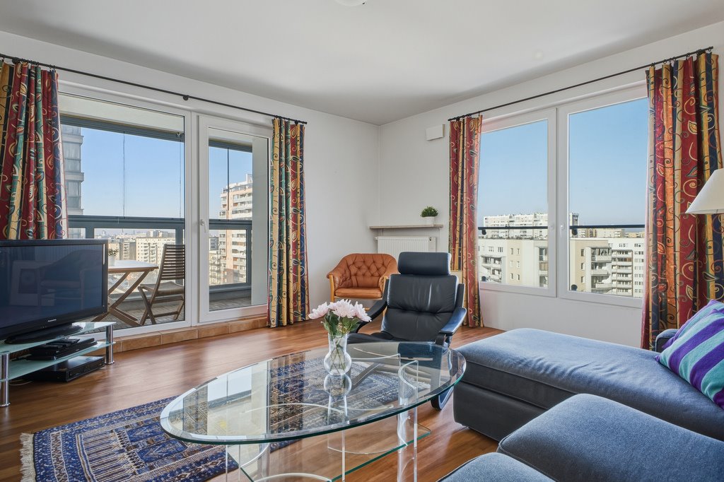 Duże okna zapewniają bardzo dobre doświetlenie, a z 10. piętra rozciąga się przestrzenny widok na okolicę. Zabudowany balkon z przeszklonymi panelami i drewnianą podłogą tarasową stanowi dodatkową przestrzeń do wypoczynku lub pracy zdalnej.