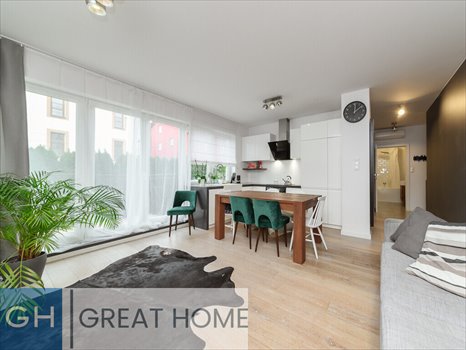Duże przeszklenia w salonie z aneksem kuchennym powodują, że do mieszkania przenika zieleń z przylegającego ogródka. Zainstalowana klimatyzacja.
