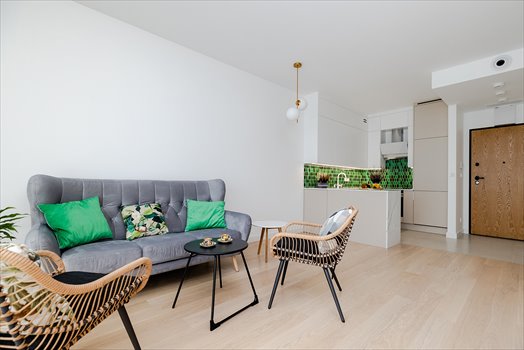 salon połączony z kuchnią. Kuchnia wyposażona w sprzęty wysokiej jakości (lodówka z zamrażalnikiem, piekarnik, zmywarka, płyta indukcyjna),