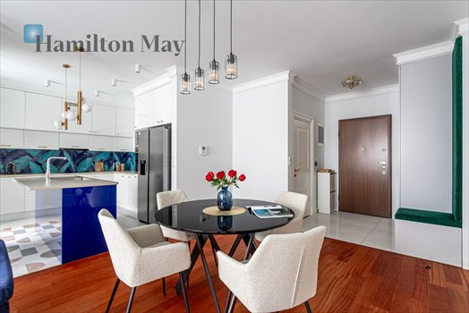Wnętrze zostało zaprojektowane z dbałością o detale i komfort użytkowania. Na podłogach znajduje się olejowany parkiet, ściany łazienek zdobią eleganckie tapety, a wysokiej klasy materiały wykończeniowe nadają wnętrzu ponadczasowy charakter. Koneserzy wina mają do dyspozycji lodówkę na wino. Apartament jest klimatyzowany, bardzo cichy (ekspozycja od spokojnej strony budynku) i doskonale doświetlony, dzięki dużym oknom.