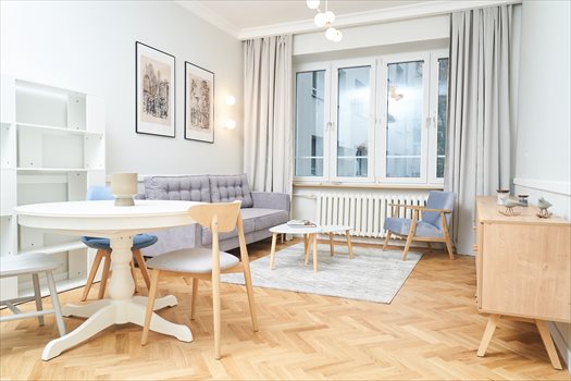 Directly - Ul. Wspólna with a view at the green square by ul. Poznańska and at the Pałac Kultury. Building from the 1950's. The apartment of 54 m2, 1st floor, completely renovated. All furniture and equipment brand new. Very convenient layout - 2 large sunny rooms and a separate kitchen. Height - 305 cm. Lots of storage space. Parking place at the inner court. Own basement space.