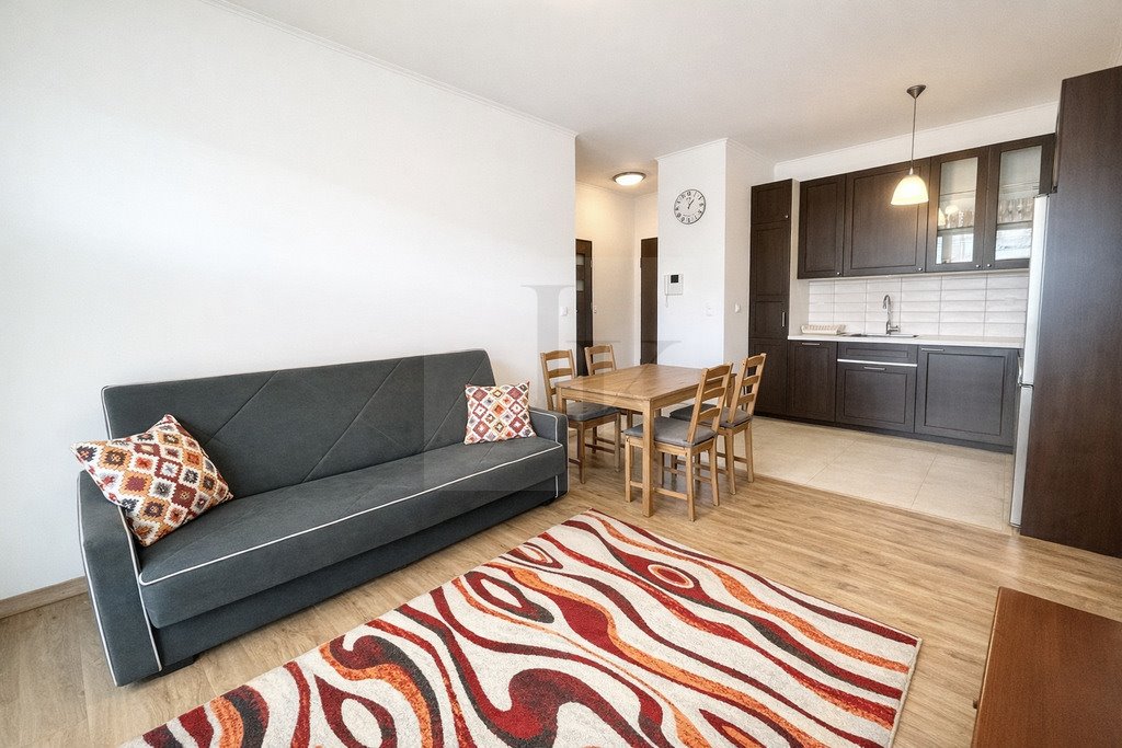 Kuchnia w zabudowie, wyposażona w sprzęt agd (zmywarka, chłodziarka z zamrażalką, piekarnik, płyta grzewcza, okap). W pokoju dziennym, rozkładana sofa, stolik, stół z krzesłami oraz szafki. W sypialni podwójne łóżko, szafa oraz szafki. Łazienka z wanną, umywalką, wc oraz z pralką.