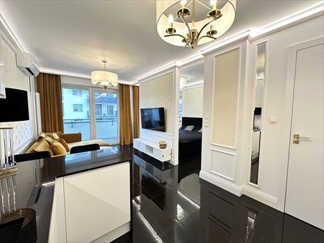 Mieszkanie jest jasne, przestronne i klimatyzowane. Urządzone zostało w eleganckim stylu glamour - dominują biel i czerń, przełamane złotymi elementami, które nadają wnętrzu wyjątkowego charakteru.