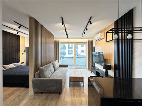 Dzięki dużym oknom lokal jest jasny, przestronny i klimatyzowany. Mieszkanie urządzone zostało w nowoczesnym stylu - proste, industrialne formy ocieplone naturalnym drewnem i kontrastującymi czarnymi detalami.