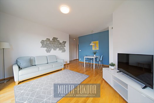 Apartament znajduje się w nowoczesnym budynku na piątym piętrze z pięknym widokiem na centrum Warszawy.