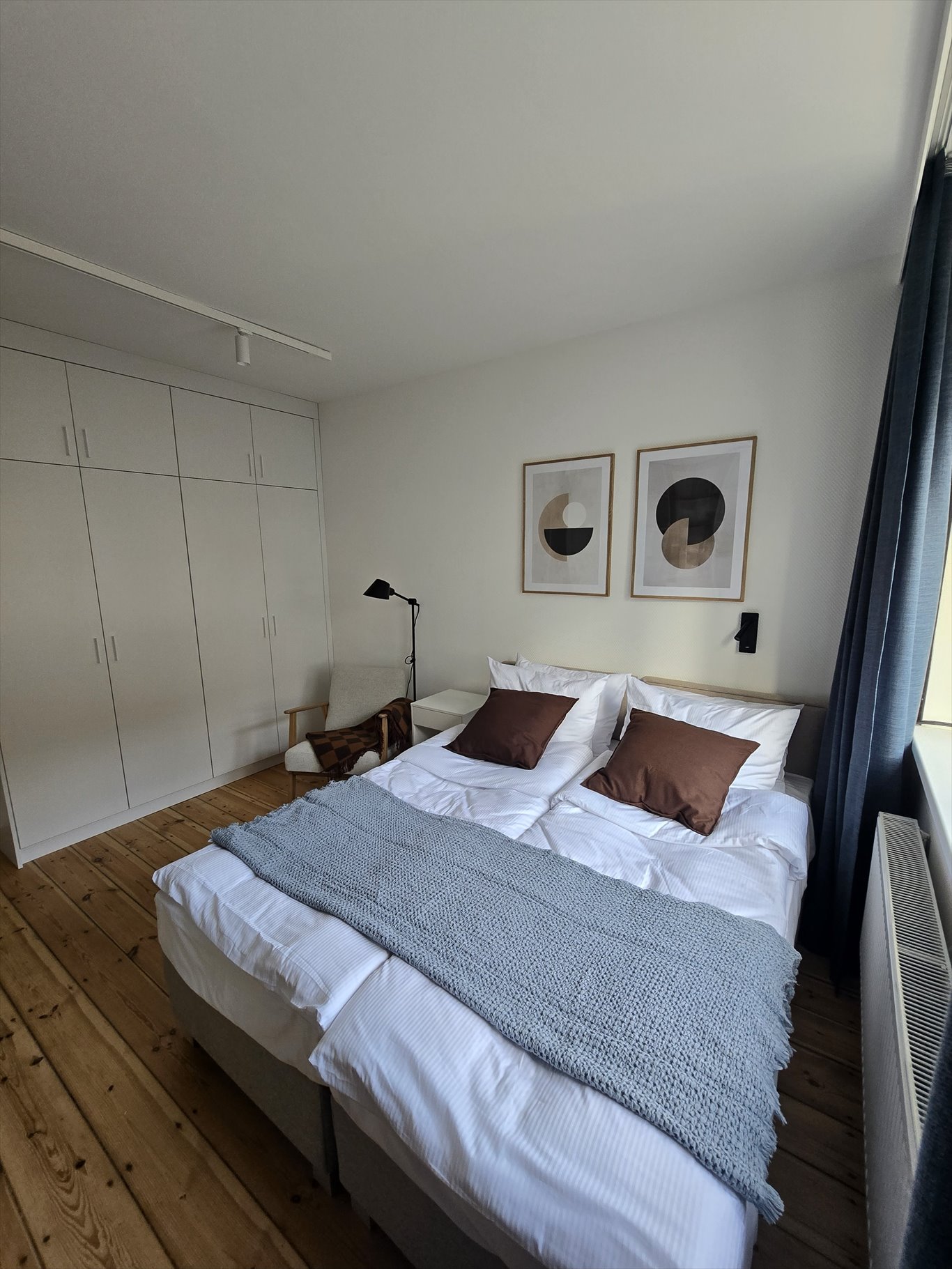 Mieszkanie składa się z 2 zamykanych pokoi: większa sypialnia dla 2 osób: para albo znajomi (łóżka w systemie hotelowym, możliwość zsunięcia lub rozsunięcia), mniejsza sypialnia przewidziana dla 1 osoby ewentualnie pary. Pokoje w pełni umeblowane i wyposażone. W każdym z pokoi łóżko/a z kompletami pościeli, szafa na ubrania, regał na książki, biurko z krzesłem-wszystko w pastelowej kolorystyce i skandynawskim stylu.