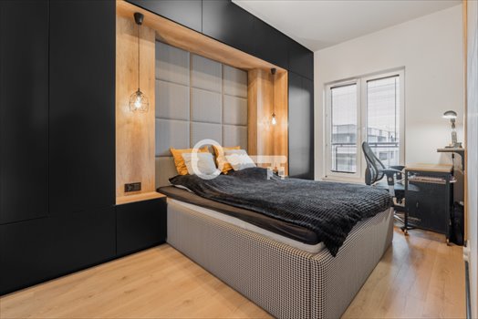* sypialnia z dużym podwójnym łóżkiem i zabudową meblową,
