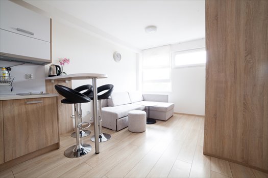 Klimatyzowany, nowoczesny mikro apartament. Pokój z aneksem kuchennym i łazienką.