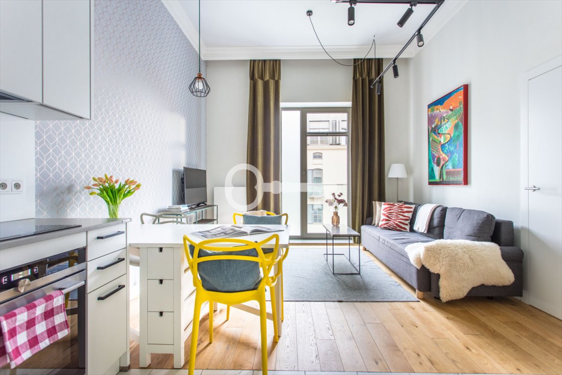 The apartment features a modern design with Scandinavian elements, creating a cozy and stylish space. High-quality finishing materials have been used, and the consistent color scheme gives the interior an elegant look. In addition, the 3.4-meter-high ceilings enhance the impression of spaciousness and add a majestic character to the interior. The fully equipped kitchen and bathroom provide comfortable living conditions. The kitchen is equipped with a refrigerator, freezer, oven, induction hob, hood, sink, and kettle.