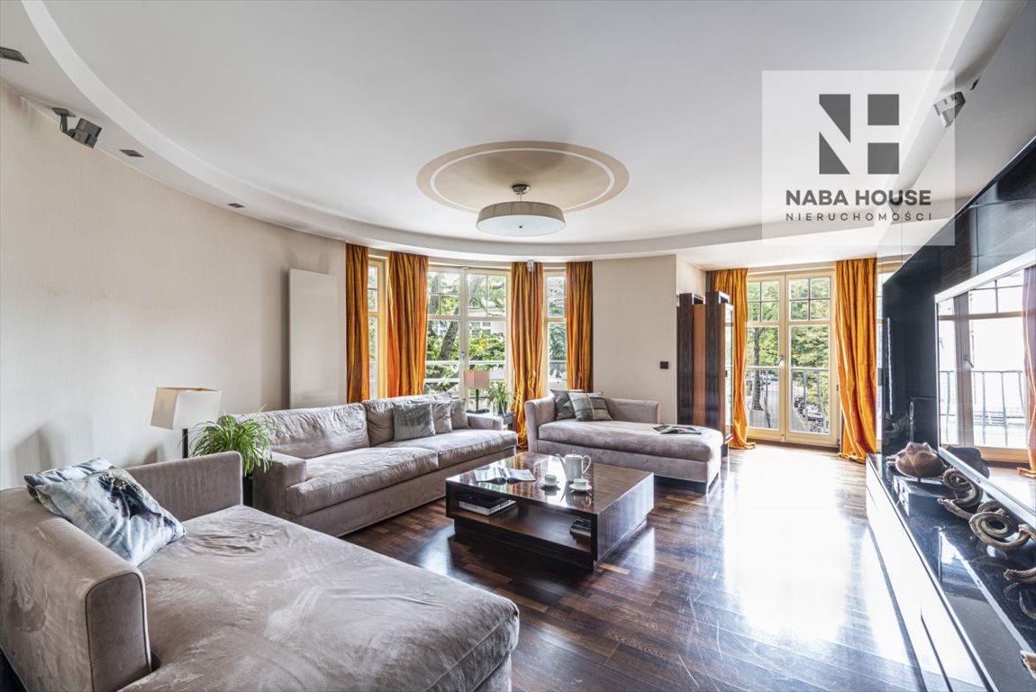 Salon to bardzo słoneczna przestrzeń z uwagi na dużą ilość okien o południowej ekspozycji, wpuszczających do wnętrza znaczną ilość naturalnego światła. Luksusowy zestaw mebli z lakierowanego drewna, elegancki komplet wypoczynkowy i piękna dębowa podłoga dodają klasy wnętrzu.