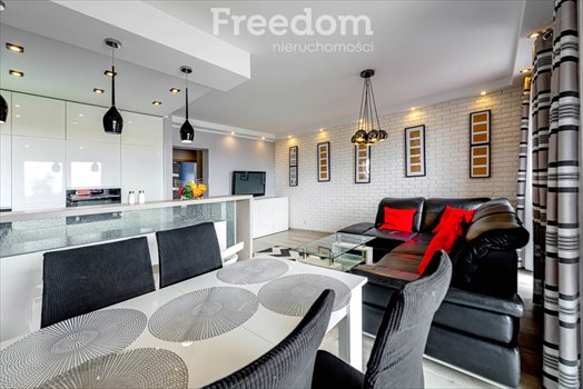 Nowoczesna kuchnia została w pełni wyposażona w wysokiej klasy sprzęty AGD oraz praktyczne szafki w zabudowie. W salonie znajduje się duża skórzana rogówka, komoda z telewizorem oraz stół z krzesłami, co zapewnia komfort zarówno w strefie wypoczynku, jak i jadalni.
