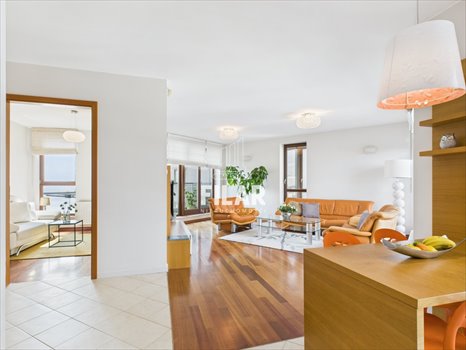 The flat is located on the 6th floor (10 storeys) of the Sea Towers building, and its area of 77 m2 consists of a living room with a separate kitchenette, two rooms, a bathroom and a separate toilet. The living area of the flat is equipped with two sofas, an armchair and a coffee table. On the media wall there is a large TV and a RTV cabinet. In the kitchen area of the apartment there is a stylish development in shades of white and wood. The living room of the flat has a direct exit to the balcony, which offers a beautiful view of the Bay of Gdańsk and the yacht marina. The panoramic windows on the opposite side face the vibrant Gdynia skyline. The overall arrangement of the flat allows you to enjoy the sun all day long. One of the bedrooms of the flat is equipped with a large bed and capacious built-in wardrobes, in the second bedroom there is a double sofa bed. There are two bathrooms in the flat. One of them has a bathtub, a washbasin with mirror and cabinets with shelves, in the other there is a toilet and a shower. The flat is dominated by a decor in white and light brown colours, giving the rooms a classy and elegant feel.