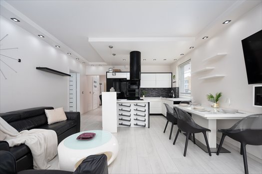 - przestronnego salonu z aneksem kuchennym i wyspą,