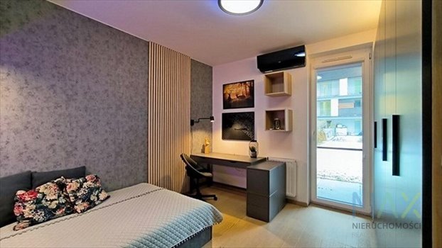 Sypialnia: łóżko, zabudowa z szafkami stojącymi i wiszącymi, szafa 5D, biurko, klimatyzator.