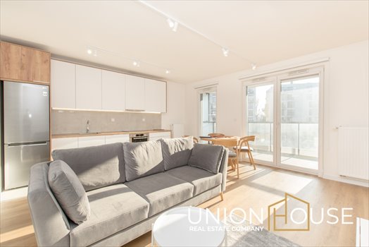 The 65-square-meter apartment, located on the second floor, comprises a spacious, well-lit living room with a fully equipped kitchenette (refrigerator, dishwasher, hob, and oven), a bedroom with a double bed, a living room (which can be arranged according to tenants' requirements), a bathroom with a shower and washing machine, a hallway, and a walk-in closet. The property also boasts a large balcony overlooking the surrounding greenery and neighboring buildings. The entire apartment is modernly furnished with attention to detail.