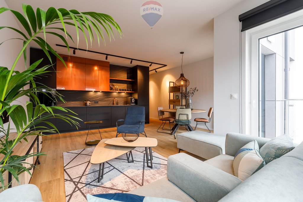 Mieszkanie jest przestronne, dobrze doświetlone i wyposażone w klimatyzację, co zapewnia komfort przez cały rok. Lokal jest w pełni umeblowany, urządzony w nowoczesnym stylu – wszystkie meble widoczne na zdjęciach pozostają do dyspozycji najemcy.