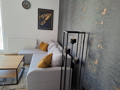 Mieszkanie i całe wyposażenie są w bardzo dobrym stanie, były zakupione dwa lata temu wraz ze sprzętem agd jest Mieszkanie składa się z umeblowanego salonu połączonego z kuchnią, dwóch pokoi, łazienki oraz przestronnego korytarza. W salonie jest narożna, rozkładana sofa, z salonu też jest wyjście na duży i słoneczny balkon. W sypialni jest łóżko małżeńskie i duża szafa ubraniowa, a w drugim pokój jest szafa z regałem i komoda. W łazience znajduje się wanna wraz ze szklaną zabudową prysznicową, toaleta oraz szafki. W korytarzu znajduje się dwudrzwiowa szafa ubraniowa. Na wyposażeniu mieszkania jest sprzęt agd, w tym: zmywarka, lodówka, płyta indukcyjna, piekarnik, okap oraz pralka. Mieszkanie jest wykończone w wysokim standardzie. Do mieszkania przynależy komórka lokatorska, znajdująca się na poziomie -1, do którego zjeżdża winda. Klatka schodowa jest estetyczna i nowocześnie zaaranżowana.