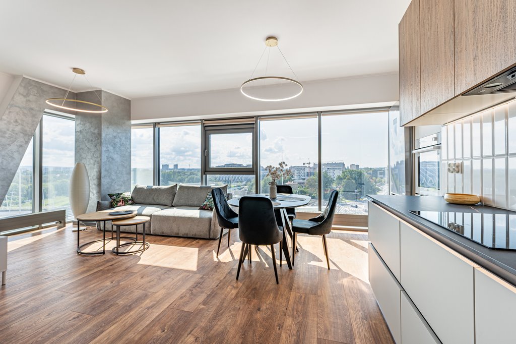 Ten słoneczny, komfortowy apartament o powierzchni 70m2 składa się z salonu, otwartej kuchni z dużym aneksem kuchennym, dwóch sypialni oraz łazienki. Nieruchomość mieści się na 4 piętrze budynku — jest ona wyposażona w okna sięgające od podłogi do sufitu, oferujące wspaniały widok na panoramę miasta. Nieruchomość została wykończona w standardzie premium i w pełni wyposażona w sprzęty RTV i AGD, w tym klimatyzację, pralkę, suszarkę, odkurzacz oraz komplet sztućców i zastawę – mieszkanie jest gotowe do natychmiastowego zamieszkania.