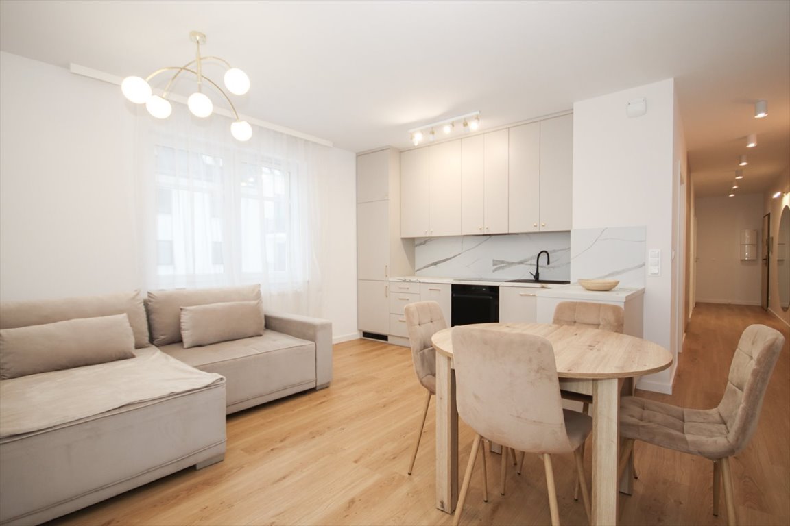 Przestronna, jasna strefa dzienna stanowiąca serce mieszkania. W części wypoczynkowej wygodna sofa oraz stolik kawowy, w jadalnianej stół z 4 krzesłami , natomiast w kuchni nowoczesna zabudowa wykonana na wymiar oraz pełne wyposażenie AGD: płyta indukcyjna, piekarnik, zmywarka, lodówka, okap.