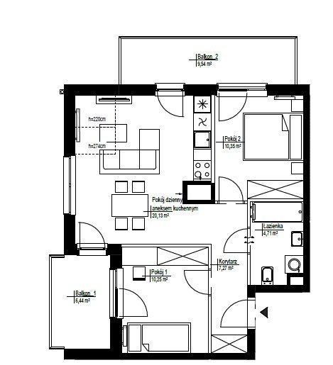 • Powierzchnia: 54 m² – idealny układ: salon z aneksem kuchennym, 2 sypialnie, łazienka