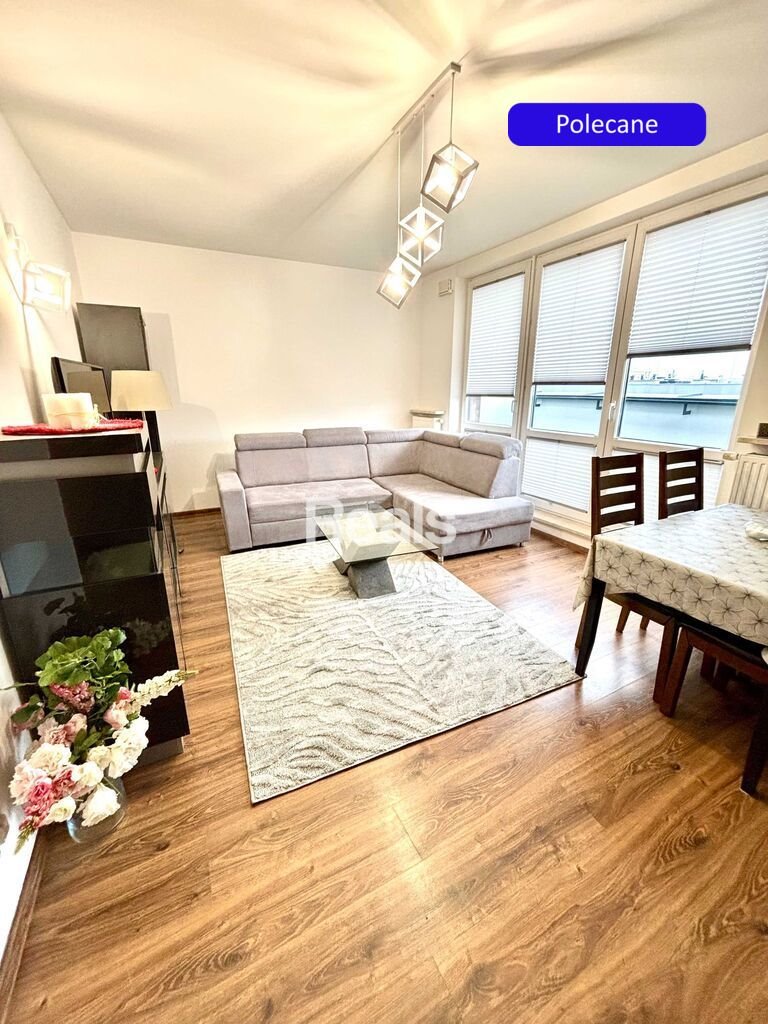 W przedpokoju znajdują się pojemne szafy przesuwne w zabudowie, jedna z lustrami. Przestronny salon z bardzo dużą, narożną kanapą, stolikiem kawowym, podwieszanymi szafkami oraz szafką RTV z telewizorem oddzielony jest przejściem od części z aneksem kuchennym. Z salonu oraz z kuchni można wyjść na 14 metrowy balkon.