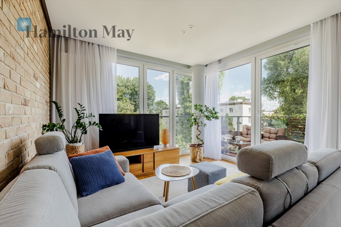 Wyjątkowy, słoneczny apartament o powierzchni 66 m² na trzecim piętrze czterokondygnacyjnego budynku, urządzony w subtelnym, współczesnym stylu z odsłoniętą ścianą cegłą, szerokimi oknami od podłogi do sufitu oraz naturalnymi deskami dębowymi. Salon płynnie łączy się z otwartą, w pełni wyposażoną kuchnią z wyspą, oświetleniem projektowym i wyjściem na prywatny balkon z widokiem na dziedziniec.