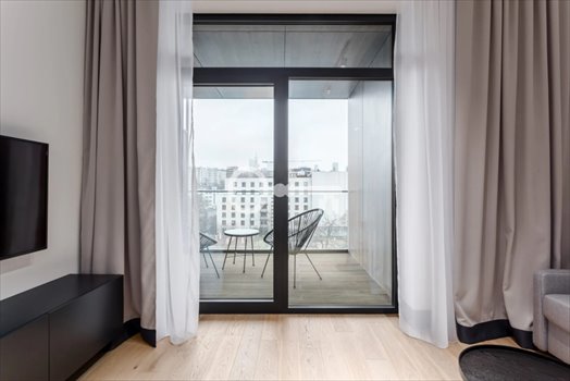 * przestronnego salonu z wyjściem na balkon, wyposażonego w wygodną sofę,