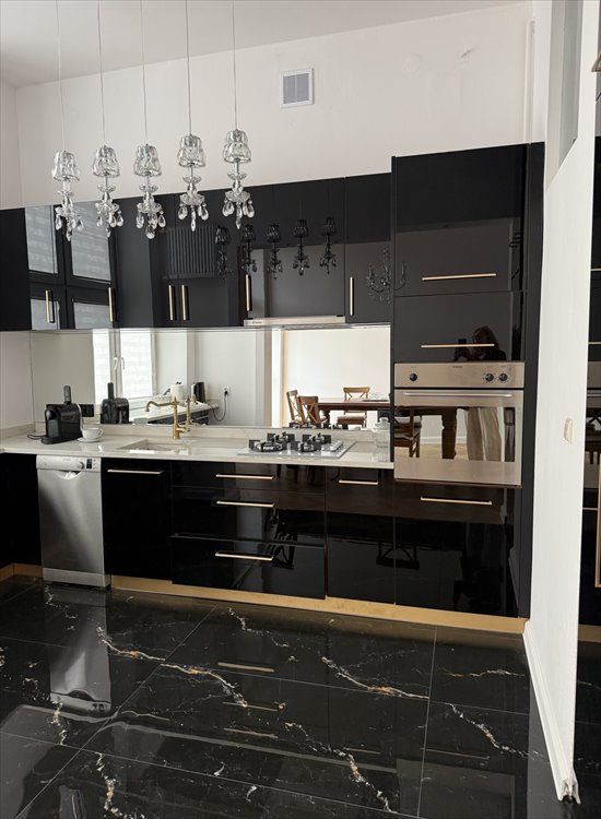 Kuchnia jest wyposażona w całkowicie nowy sprzęt, nowe modowe szafki, czarne na wysoki połysk, fronty, dają dużo dobrej energii i nowoczesności w spokojne i eleganckie wnętrze.