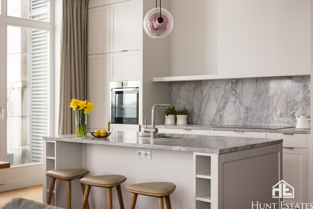 The open kitchen with a marble countertop, elegant fronts and chrome finishes impresses with the quality of the materials – this is a kitchen that actually works, not just looks.